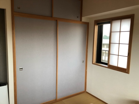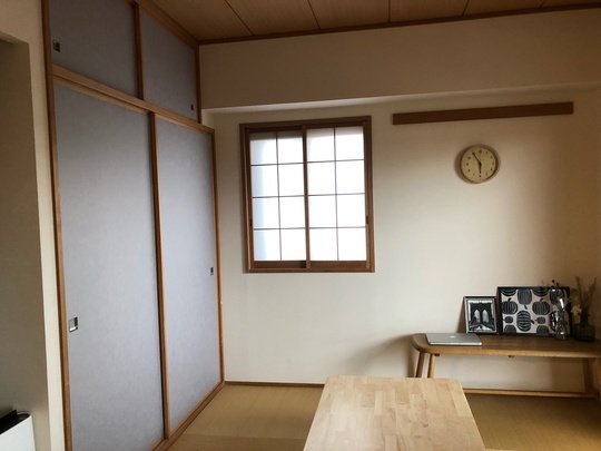 琉球畳に白い壁、一部に濃いグレーのアクセント。当然、押入の襖も白でした。お勧めはとのお話にやはり白い襖がとお勧めしましたが、奥様が選んでいただいたのは無地の薄墨色の襖でした。
