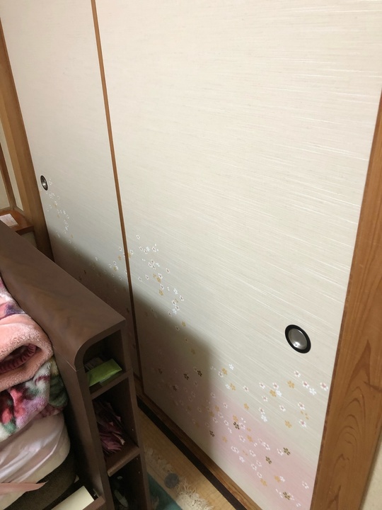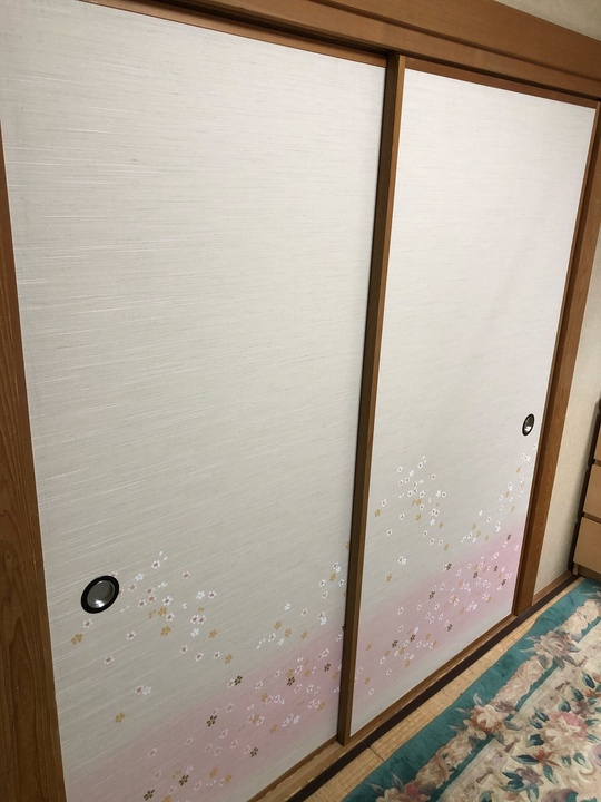 襖の柄は淡い桜のものです。とても綺麗です。障子の紙は破れにくい強力和紙を選んで頂きました。最近、この強力障子紙は好評です。サンプルをお持ちしますので実際に比べてみて頂けると分かります。