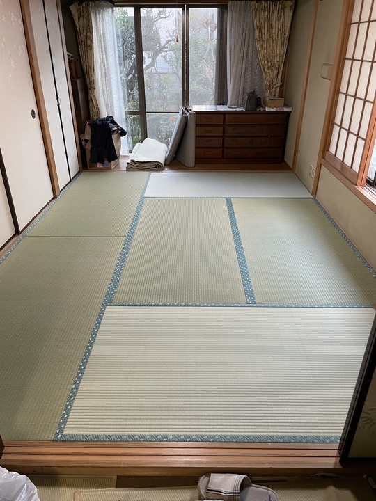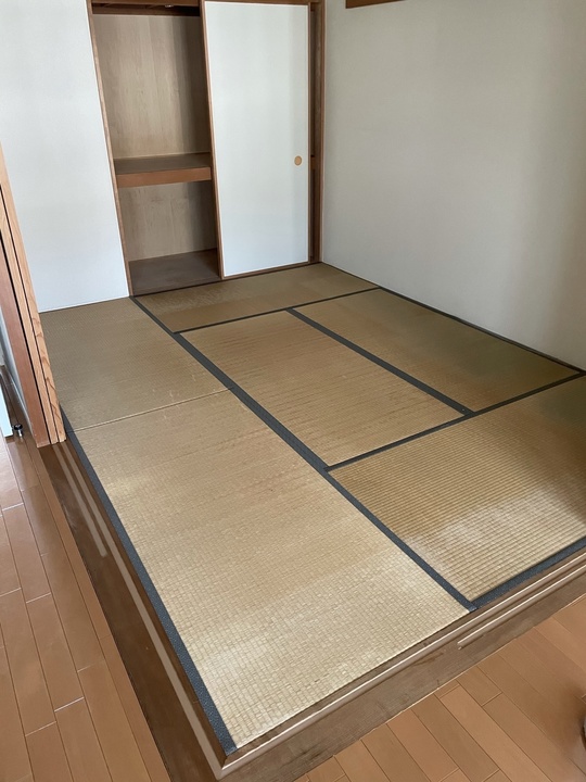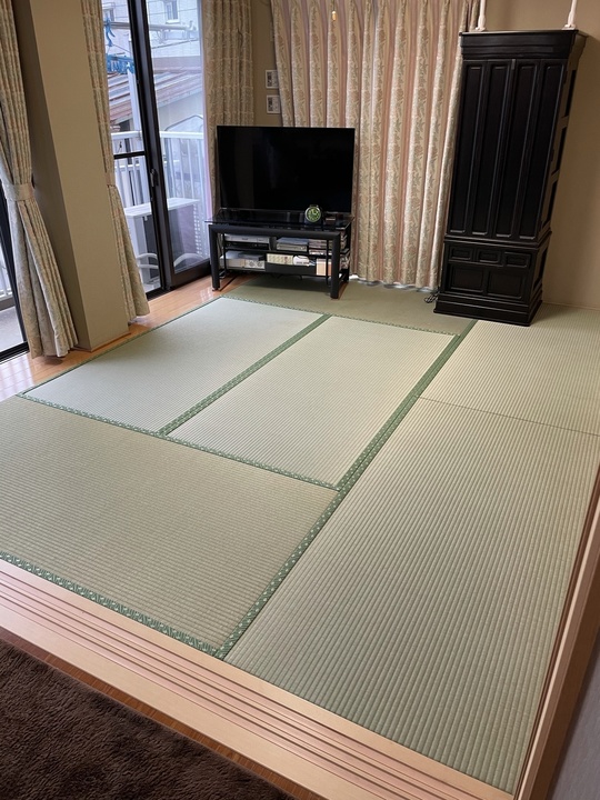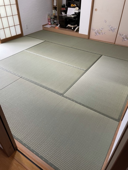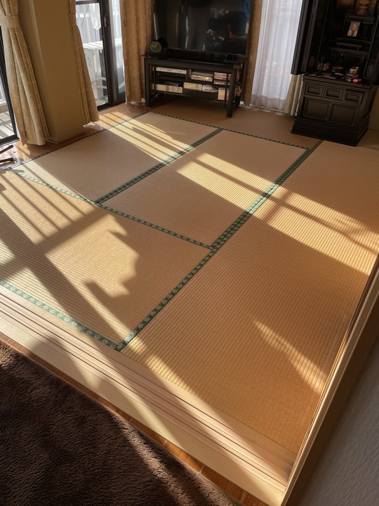 6年前の大水で1階のたたみが浸水し、それがトラウマとなって畳無しで生活していたそうです。今回周辺の治水工事も完了し、まず一間新畳のご依頼いただきました。