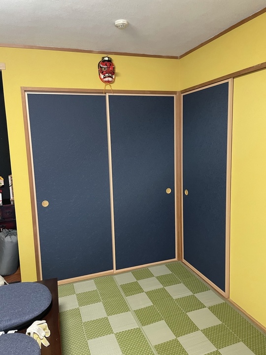 はじめは黒の襖をご希望でしたが、ワンちゃんもいることですし、和紙風の紺のクロスを襖に貼らせていただきたした。見積りに伺ったときは桜色の壁でしたが、襖と障子を引き上げに伺うと黄色の壁に塗り替えてありました。左官屋さんなのでお手の物ですね。