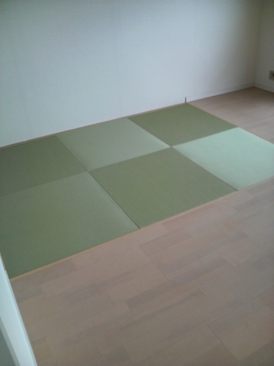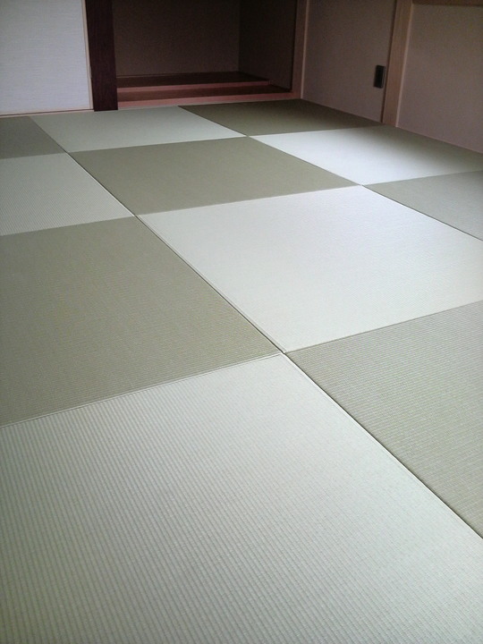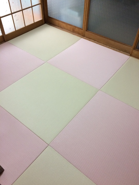 古くなった皮のむけてきた琉球表ヘリ無し畳からカラーのヘリ無し和紙畳に入替しました。