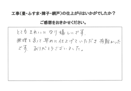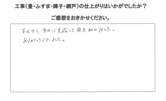 ちょうどお客様には1か月お待ちいただいて折、娘さんのお引越しが1週間余しかないとのことで、ご事情なので急遽工事させていただきました。
