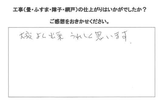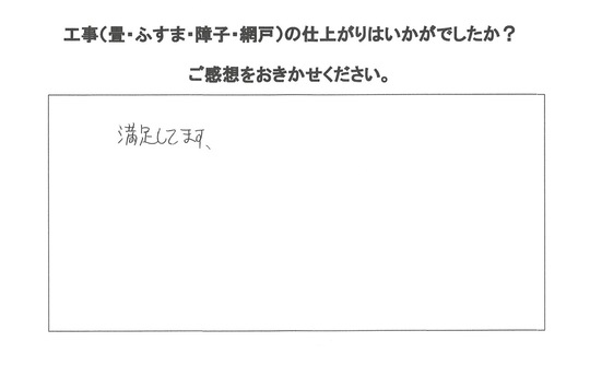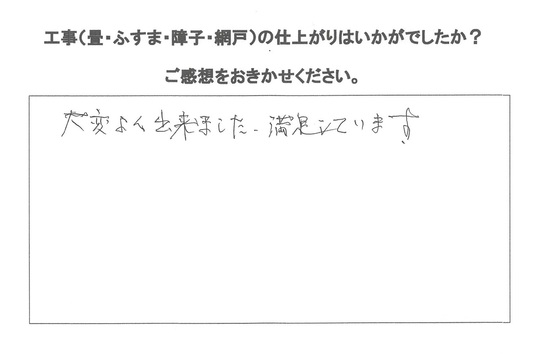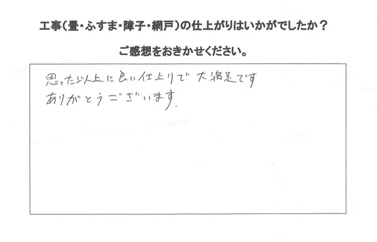 畳を和紙表とわんにゃんスマイル表をお勧めしましたが息子さんの一言でわんにゃんスマイル表で。見た感じそんなに違和感ない色合いでお客様に満足いただけたようです。